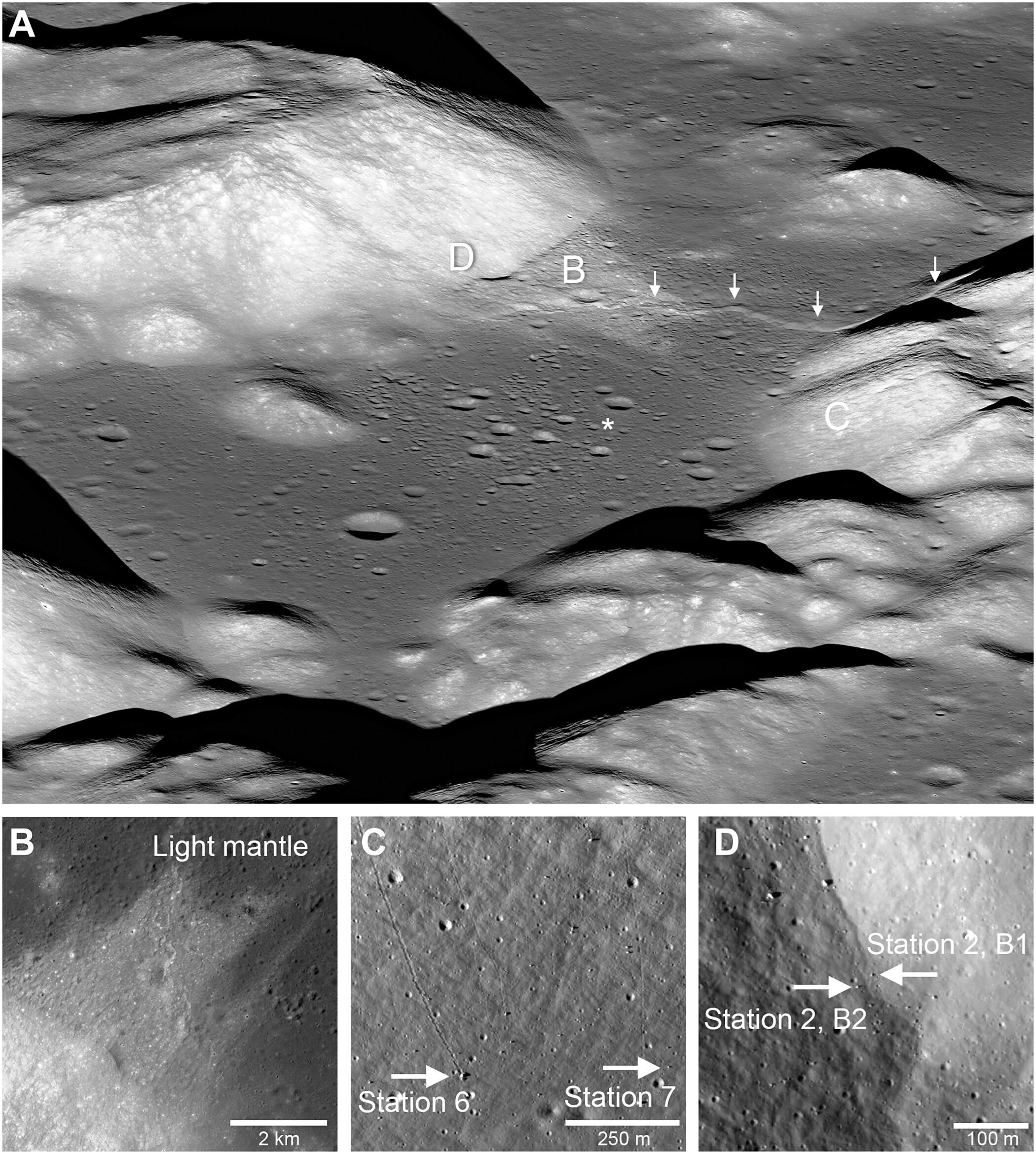 (A) Lunar Reconnaissance Orbiter Camera Narrow Angle Camera (LROC NAC) oblique of the valley. The Lee-Lincoln fault scarp cuts across the valley floor (arrows). (B) The light mantle landslide deposit across the valley floor from South Massif. (C) Apollo 17 mission Station 6 and 7 boulders at the base of North Massif (arrows). (D) Apollo 17 Station 2, boulders 1 and 2 at the base of South Massif. The approximate locations of the boulders and light mantle landslide deposit are shown in (A) by panel letters. The asterisk shows the approximate location of the Apollo 17 Lunar Module. Source: Science.org